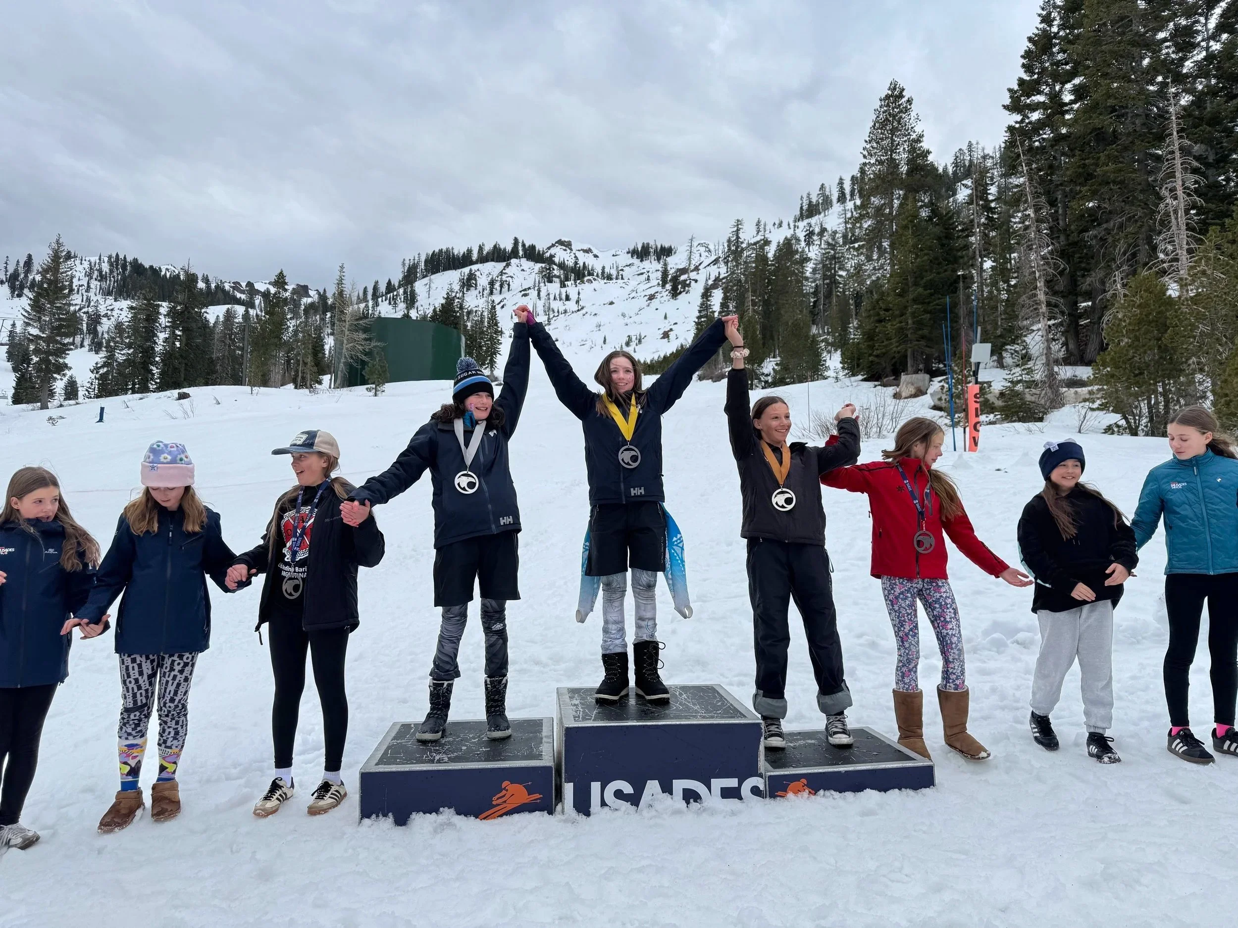 Our Alpine U12 competed in a 2xSL race at Alpine Meadows, and our SBA team took first place in both races in both the boys and girls categories!